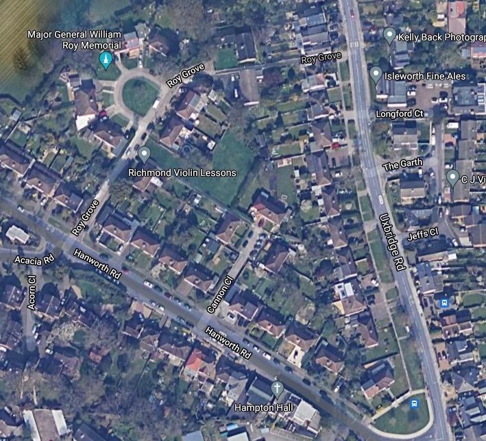 The Major General William Roy Memorial Cannon was a little further than I expected in Roy Grove (TW12 3DN), in the far corner of a rather nondescript close of small detached houses. Roy was born in Lanarkshire, and was an accomplished surveyor and map-maker and in 1765 was put in charge of military surveys in Britain. 1783 the President of the Royal Society commissioned Roy to take charge of an English survey. The spot on Roy Grove where the canon sits was the starting point for that.